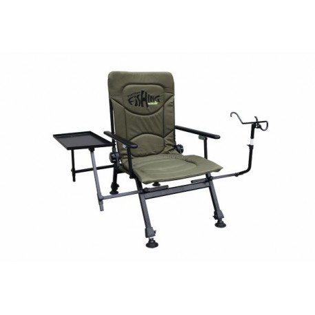 Folding camping chair, features a adjustable back, wide armrests, small side table and a fishing rod holder. Perfectly suitable for fishing.